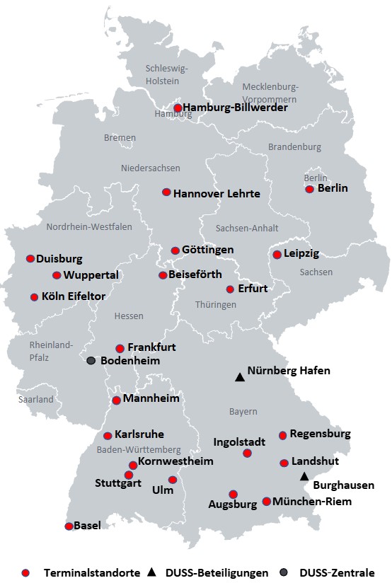 Mit ihren Terminals zählt die DUSS zu den größten Terminalbetreibern in Deutschland. Auch im europäischen Vergleich ist die DUSS ein führender Anbieter im Terminalgeschäft des Kombinierten Verkehrs.